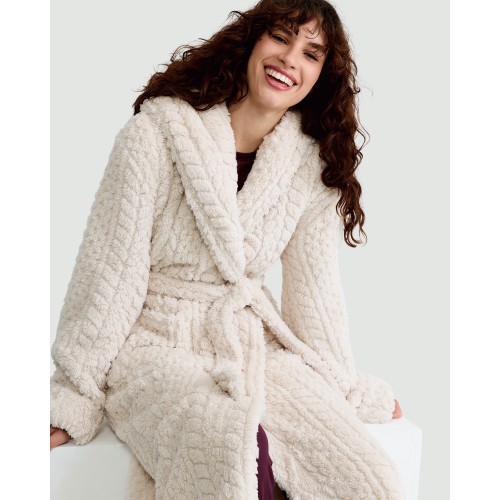 Fleece Cable Knit Hooded Dressing Gown in Cream