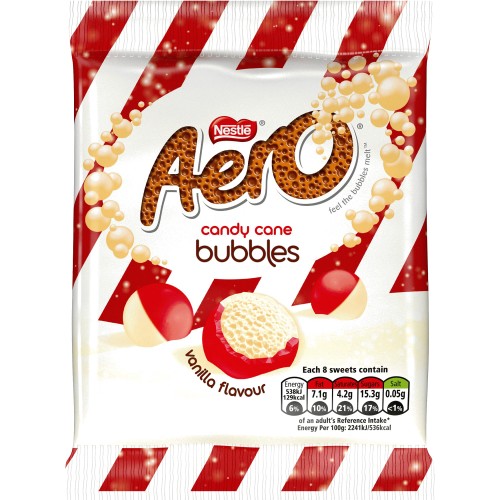 AERO Candy Cane Bubbles have a smooth half white and half red shell and a light, bubbly vanilla flavoured centre