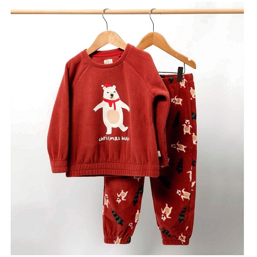 Girls Fleece Bow Print Shirt and Bottoms Pyjama Set in Burgundy