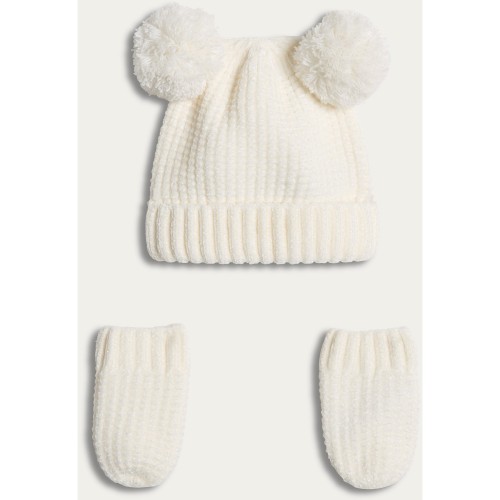 Baby 2-Piece Chenille Pom Pom Hat and Mittens Set in Cream