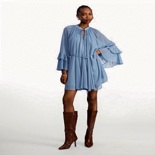 Tiered Sleeve Tie Waist Mini Dress in Blue