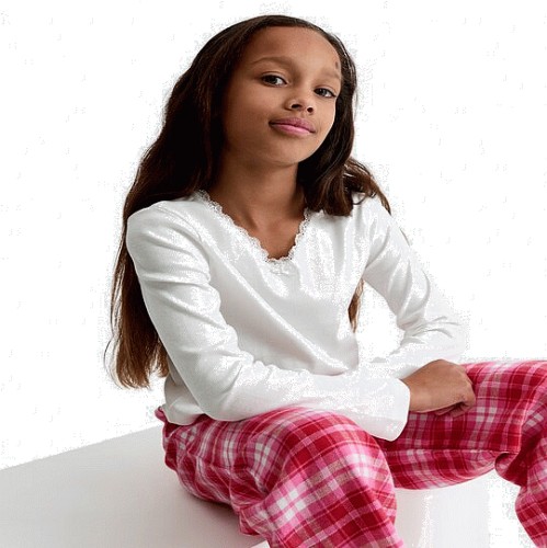 Girls Cotton Rich Lace Trim Top and Check Trousers Pyjamas in Cream Multi