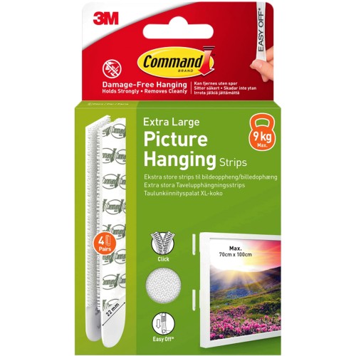 Command Picture Hanging Strips hold up to 5.4 kg (medium) or 7.2 kg (large) of weight