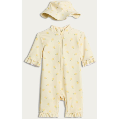 F&F Baby 2-Piece Lemon Print Sunsafe Swimsuit and Hat Set in Yellow