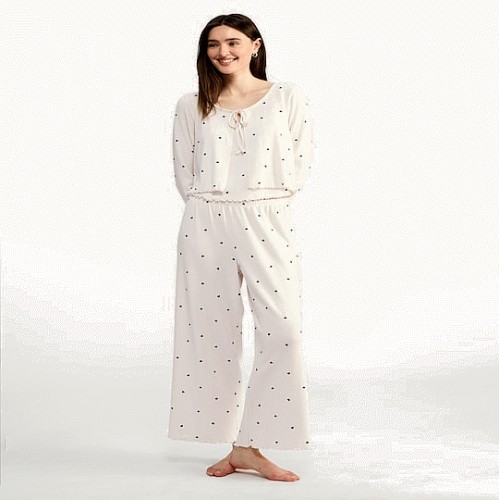 3-Piece Ribbed Heart Print Pyjama Set in Beige