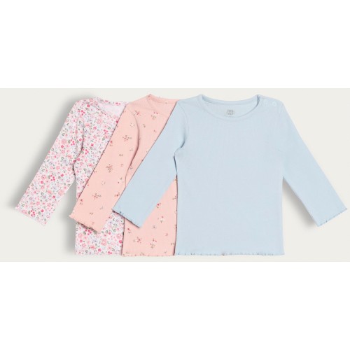 3-Pack Cotton Rich Floral and Plain Long Sleeved Tops in Pink