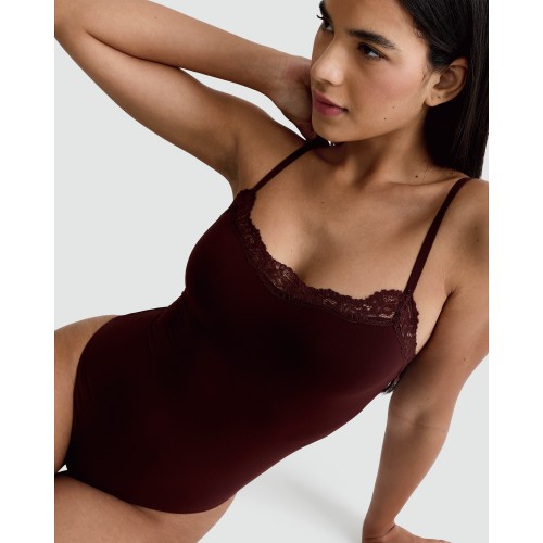 Contour Strappy Lace Trim Bodysuit in Burgundy