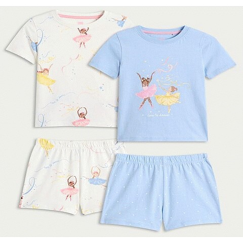 Girls 2-Pack Pure Cotton Ballerina Print Top and Shorts Pyjama Sets in Blue