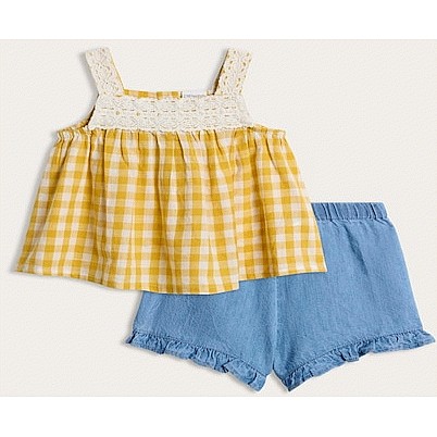 2-Piece Pure Cotton Gingham Sleeveless Top and Denim Shorts Set in Yellow