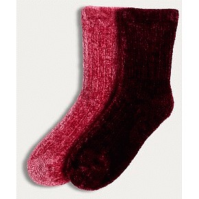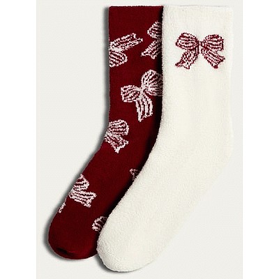 2-Pack Fluffy Bow Print Cosy Socks in Burgundy