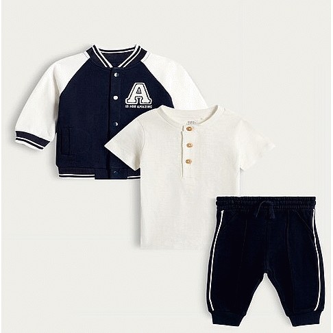 3-Piece Pure Cotton Varsity Bomber Jacket T-Shirt and Jogger Set in Navy