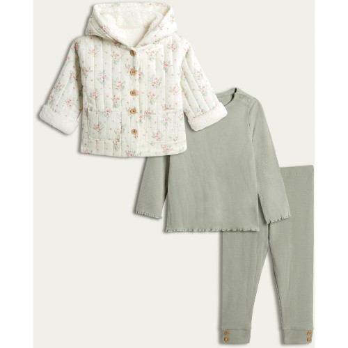 3-Piece Pure Cotton Ribbed Floral Print Cardigan Bodysuit and Legging Set in Cream