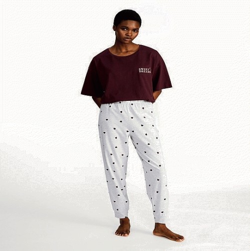 3-Piece Ribbed Heart Print Pyjama Set in Beige