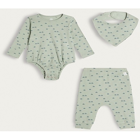 3-Piece Cotton Rich Car Print Bodysuit Legging and Bib Set in Green