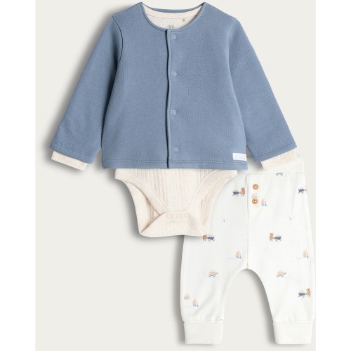 3-Piece Cotton Rich Cardigan Bodysuit and Legging Set in Blue