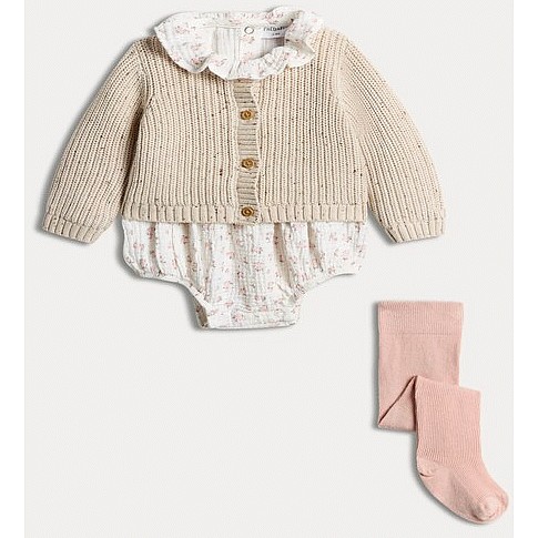 3-Piece Pure Cotton Ribbed Floral Print Cardigan Bodysuit and Legging Set in Cream