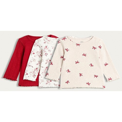 3-Pack Cotton Rich Floral and Bow Long Sleeved Tops in Red