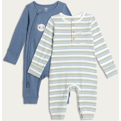 2-Pack Cotton Rich Ribbed Animal and Stripe Print Sleepsuits in Blue