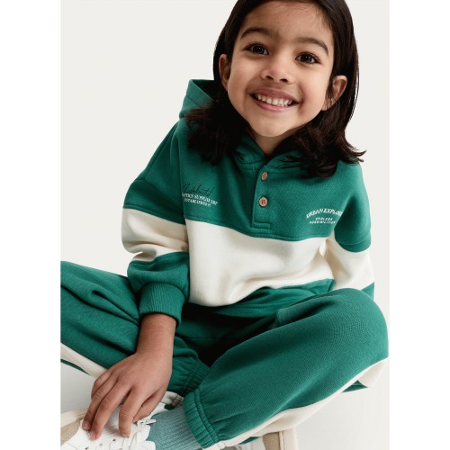 F&F Boys 2-Piece Cotton Rich Colour Block Slogan Hoodie and Joggers Set in Green