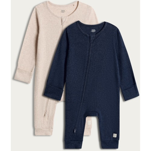 2-Pack Cotton Rich Ribbed Long Sleeved Zip Up Sleepsuits in Blue