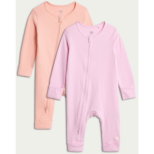 2-Pack Cotton Rich Ribbed Zip Up Sleepsuits in Pink