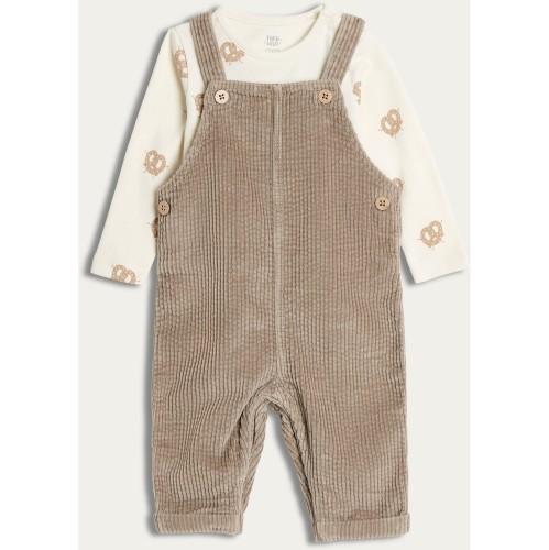 2-Pack Pure Cotton Corduroy Dungarees and Pretzel Print Bodysuit Set in Tan