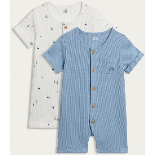 2-Pack Cotton Rich Waffle Textured Short Sleeved Rompers in Blue