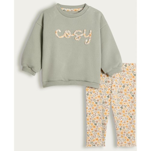 2-Piece Cotton Rich Cosy Floral Sweatshirt and Leggings Set in Green