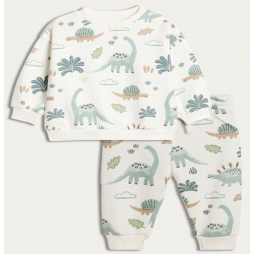 2 Piece Cotton Rich Dinosaur Print Jumper and Joggers Set in White