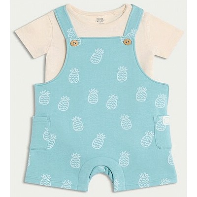 2-Piece Cotton Rich Printed Dungarees and Bodysuit Set in Turquoise