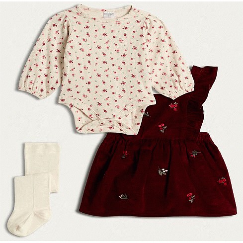 3-Piece Embroidered Corduroy Pinny Floral Bodysuit and Tights Set in Burgundy