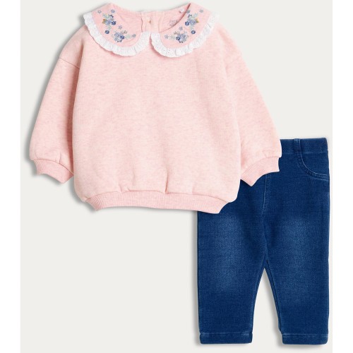 2-Piece Cotton Rich Embroidered Sweatshirt and Denim Leggings Set in Pink
