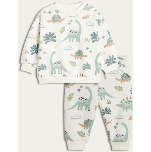 2 Piece Cotton Rich Dinosaur Print Jumper and Joggers Set in White