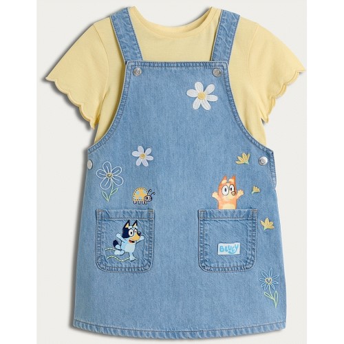 Bluey 2-Piece Embroidered Denim Pinafore and T-shirt Set in Blue