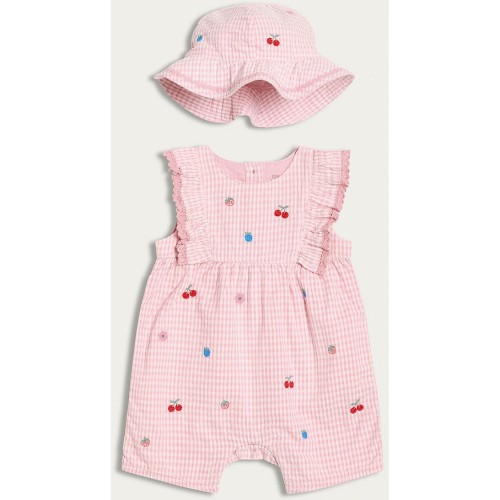2-Piece Pure Cotton Gingham Embroidered Romper and Hat Set in Pink