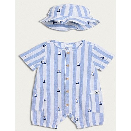 2-Piece Linen Blend Striped Romper and Hat Set in Blue