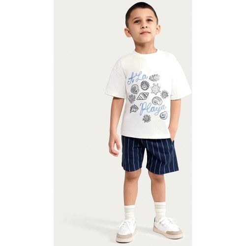 F&F Boys 2-Piece Pure Cotton A La Playa T-Shirt and Striped Shorts Set in White