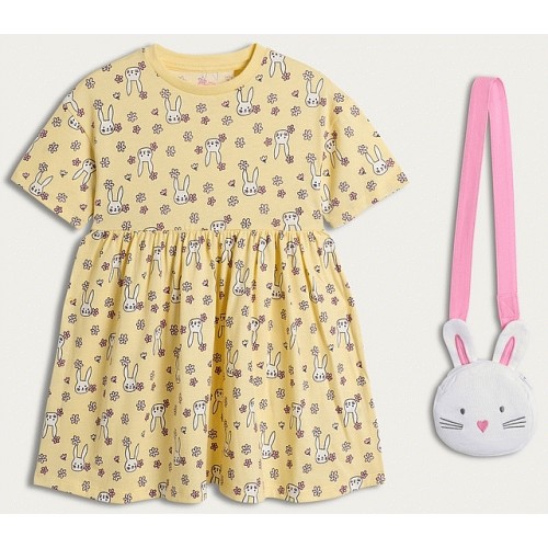 F&F Girls 2-Piece Pure Cotton Bunny Print Dress and Bag Set in Multi Yellow