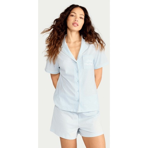 2-Piece Pure Cotton Embroidered Revere Short Pyjama Set in Blue