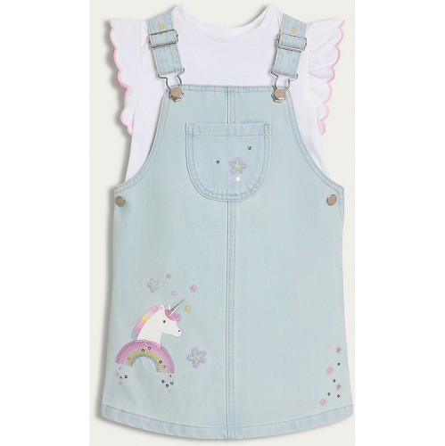 F&F Girls 2-Piece Pure Cotton Unicorn Embroidered Denim Pinafore Dress and T-Shirt Set in Blue