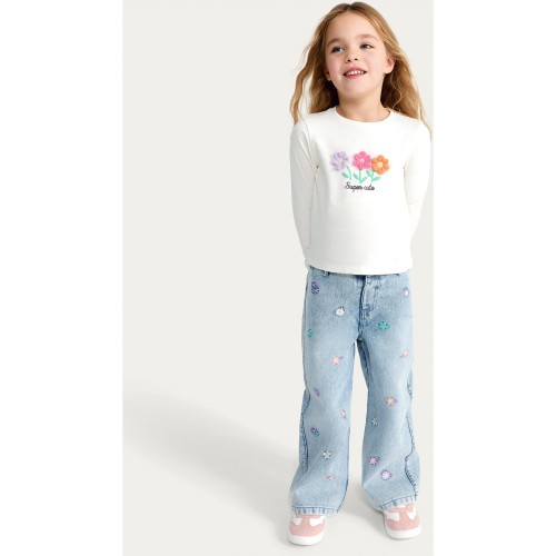 F&F Girls 2-Piece Pure Cotton Floral Embroidered Top and Jeans Set in Blue