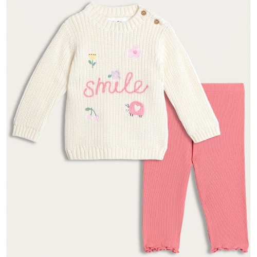 2-Piece Cotton Rich Smile Knitted Jumper and Ribbed Leggings Set in Pink