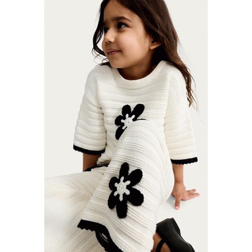 F&F Girls 2-Piece Pure Cotton Knitted Textured Flower Top and Trousers Set in Cream