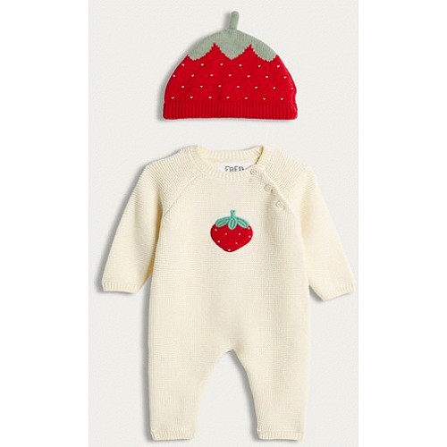 2-Piece Pure Cotton Knitted Strawberry Romper and Hat Set in White