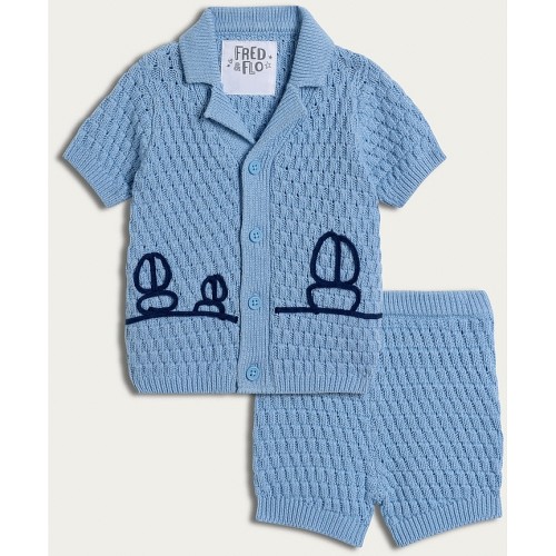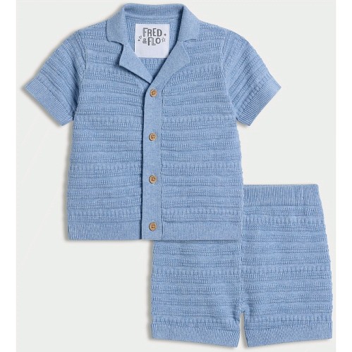 2-Piece Pure Cotton Textured Knitted Shirt and Shorts Set in Blue