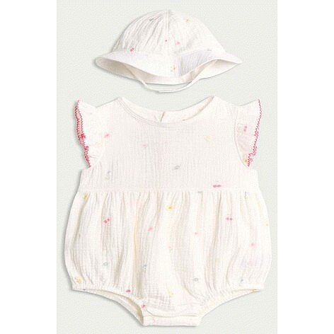 2-Piece Pure Cotton Textured Romper and Hat Set in White