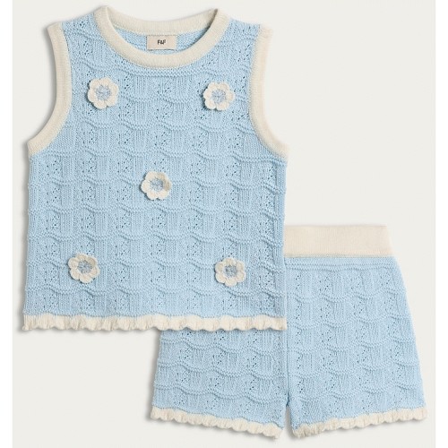 F&F 2-Piece Girls Pure Cotton Knitted Flower Top and Shorts Set in Blue