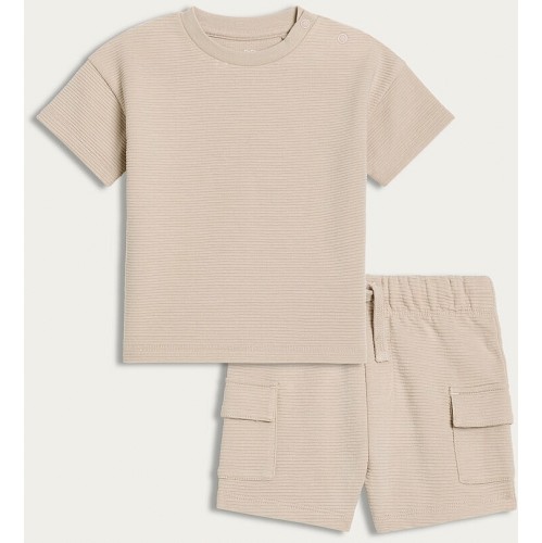 2-Piece Pure Cotton Ribbed T-Shirt and Cargo Shorts Set in Neutral