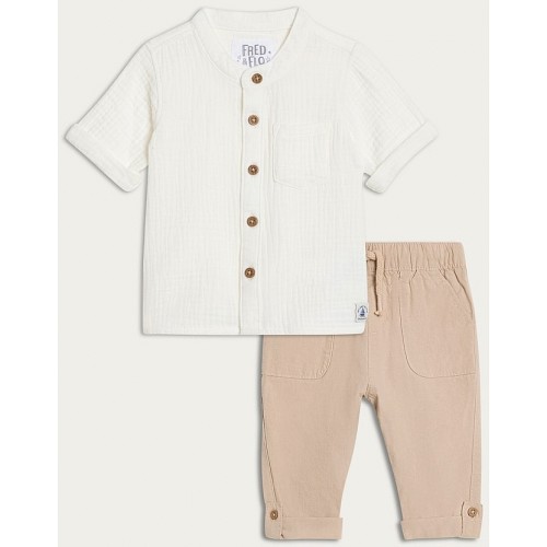 2-Piece Pure Cotton Grandad Textured Shirt and Trouser Set in White