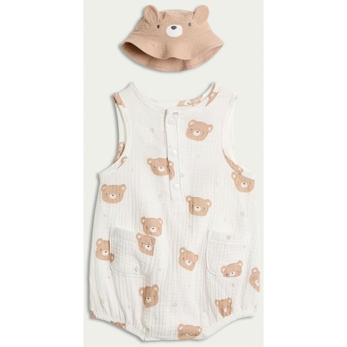 2-Piece Pure Cotton Bear Print Romper and Hat Set in White